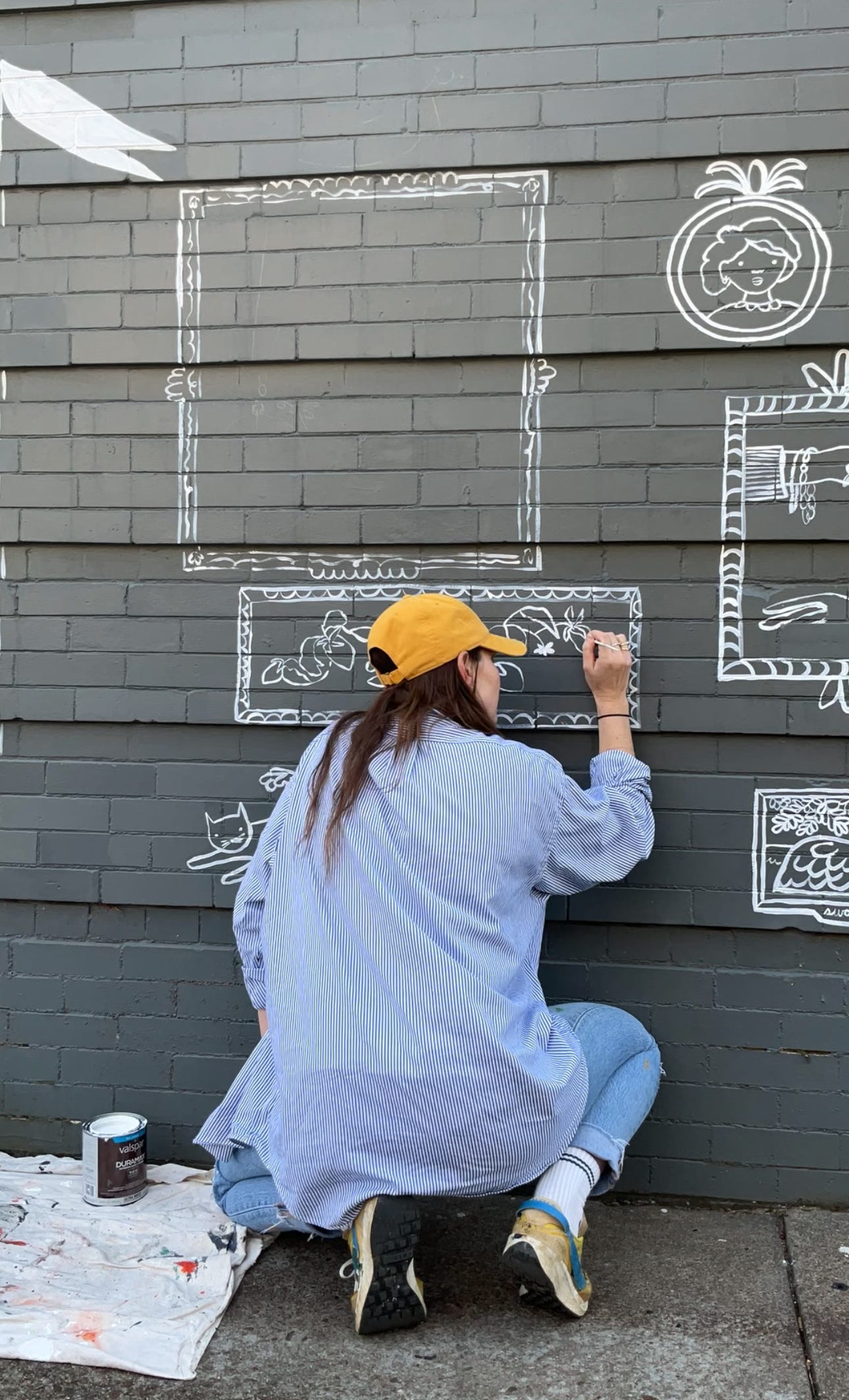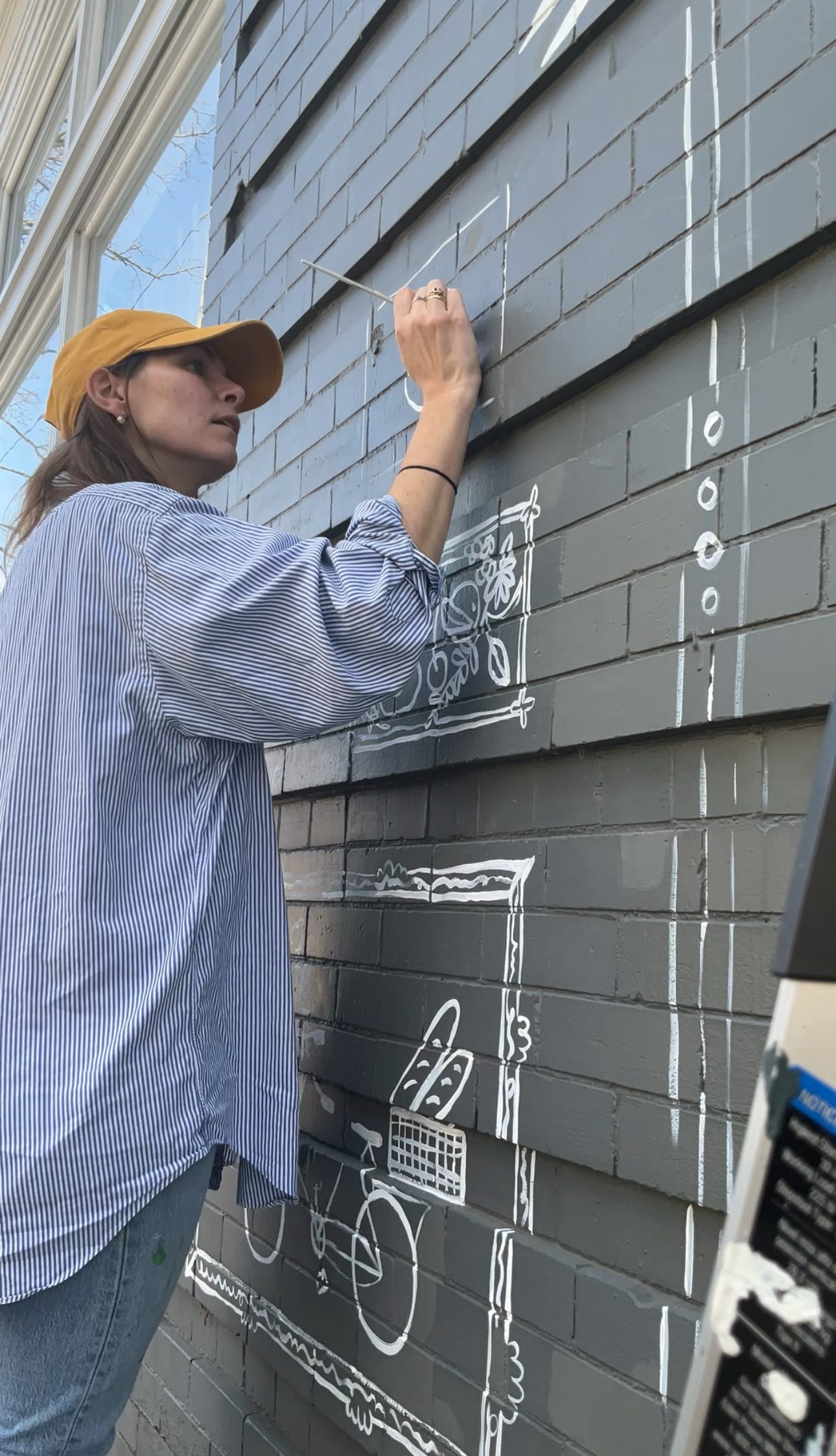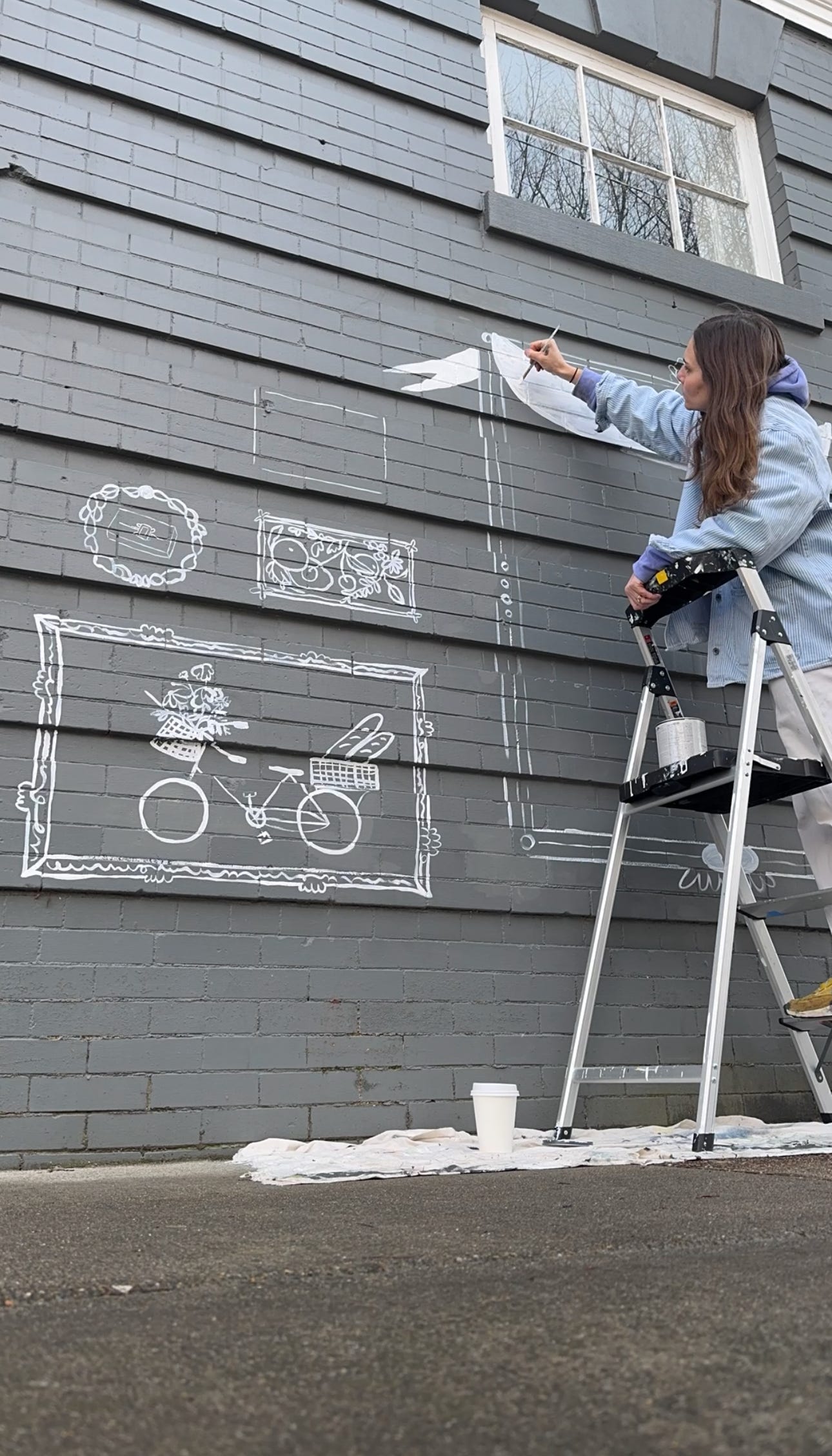 Working on an outdoor mural for Emily Warden Designs in Richmond, VA. Realizing this is my first outdoor mural in Richmond. I was thinking back to my first ever outdoor mural on the corner of 10th and Ave. C in the East Village in New York City. I set up my supplies, feeling like I was playing the role of artist. I bought spray paint because I thought I needed to use spray paint for an outdoor mural - how else would I cover such a big space? Flash forward to yesterday and I am rummaging through my brushes in my studio to find my smallest brush.