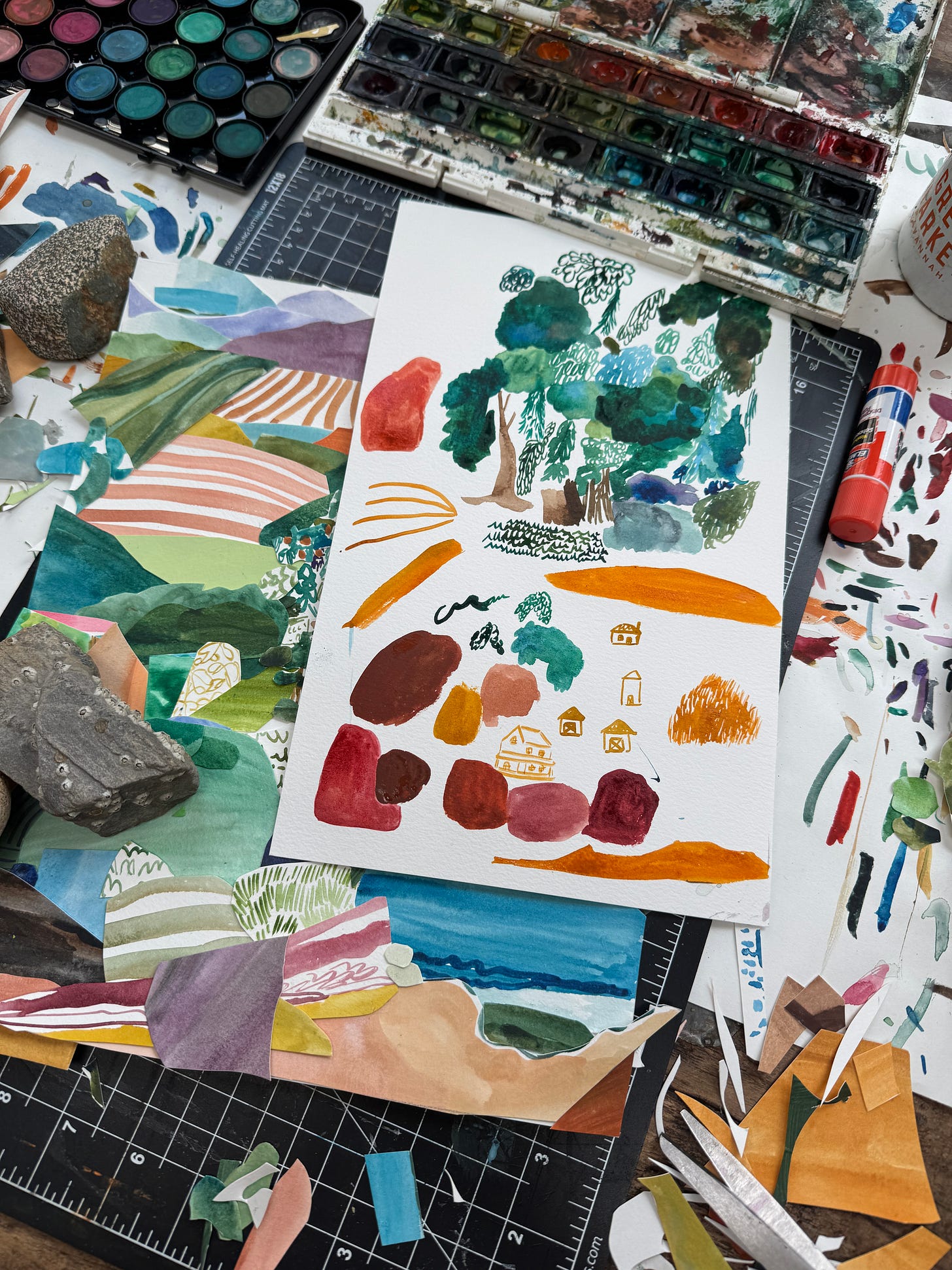 Sending off files, updating them, re-sharing new versions, wrapping up a painting, writing a thank you card, packaging them up together, grabbing brushes, moving the rocks over to glue more and then put them back on the page, seeing the watercolor dried light so adding another later on top, or two, cutting out stars, cutting out fields, cutting out tree tops and layering them, drawing with paint on the wall, slowly, on bumpy brick, iPad set up to grab a timelapse or two, talking to neighbors, bikers wave and say good job, going over lines again and again, running to pick up one kid, then another, then home and milk and snack and nap / quiet time, then play and dinner and clean up and dishes and vacuum and bath time and handing off and handing back and then quiet. Then key in the door to the studio and start part two for the day.