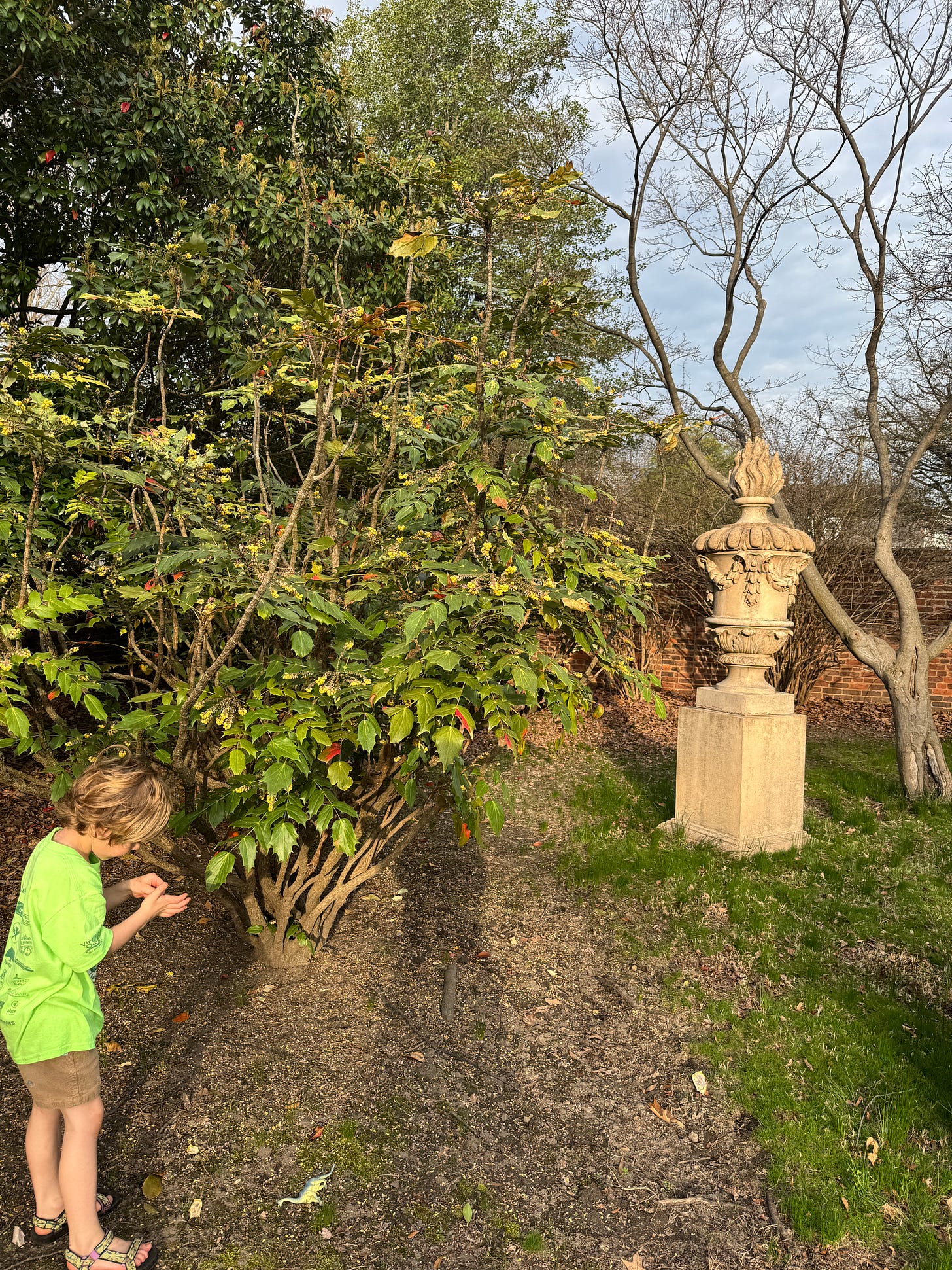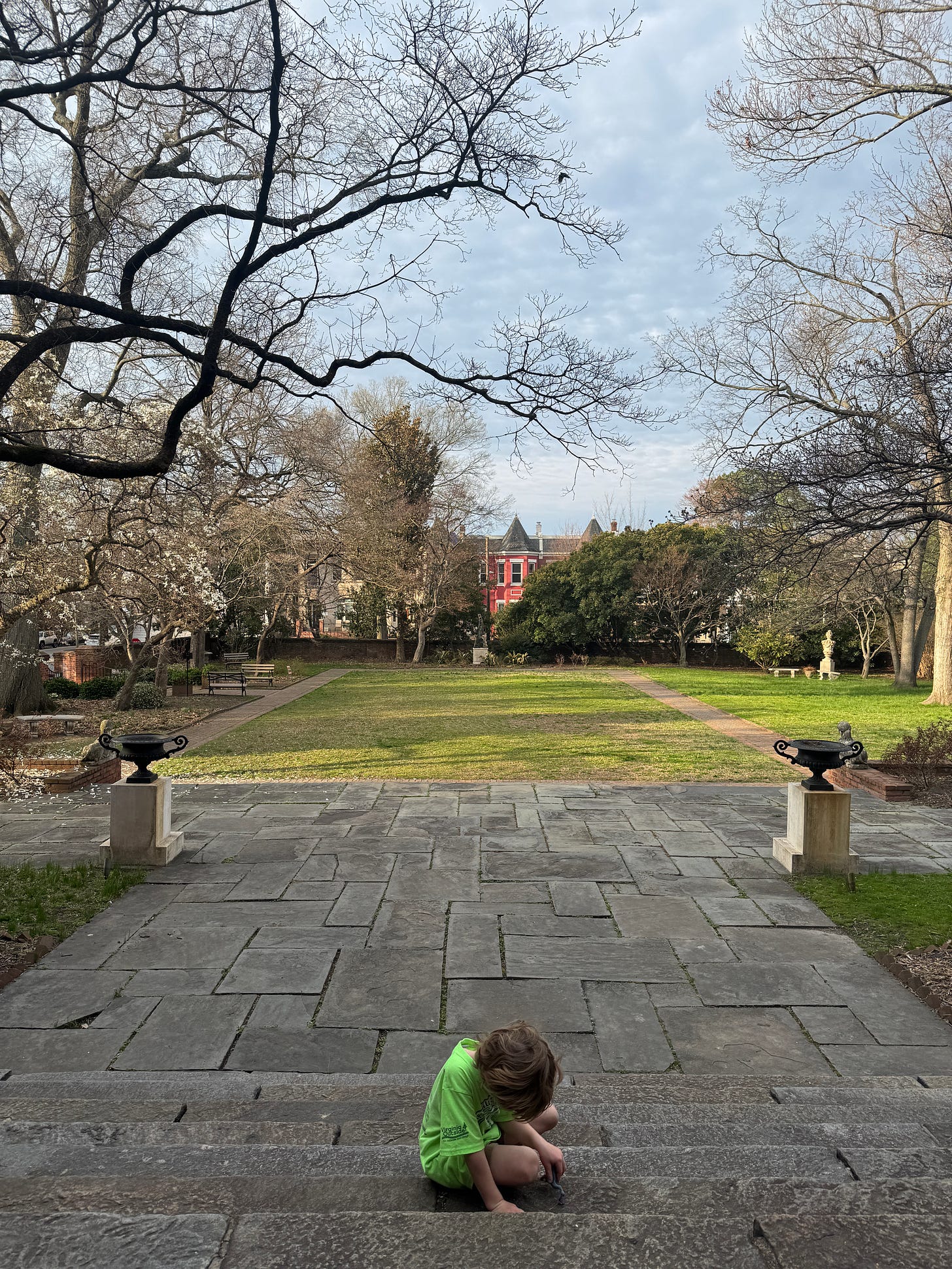 We walked to the Secret Garden. We find a tiny toy dinosaur in a bush. We read Magic School Bus Waterworks on a concrete bench next to an tall urn. Made me think of our favorite Elizabeth Street Garden in NYC and bringing Theo there in a stroller when he was little. I get to the studio and sketch out an urn for my book.