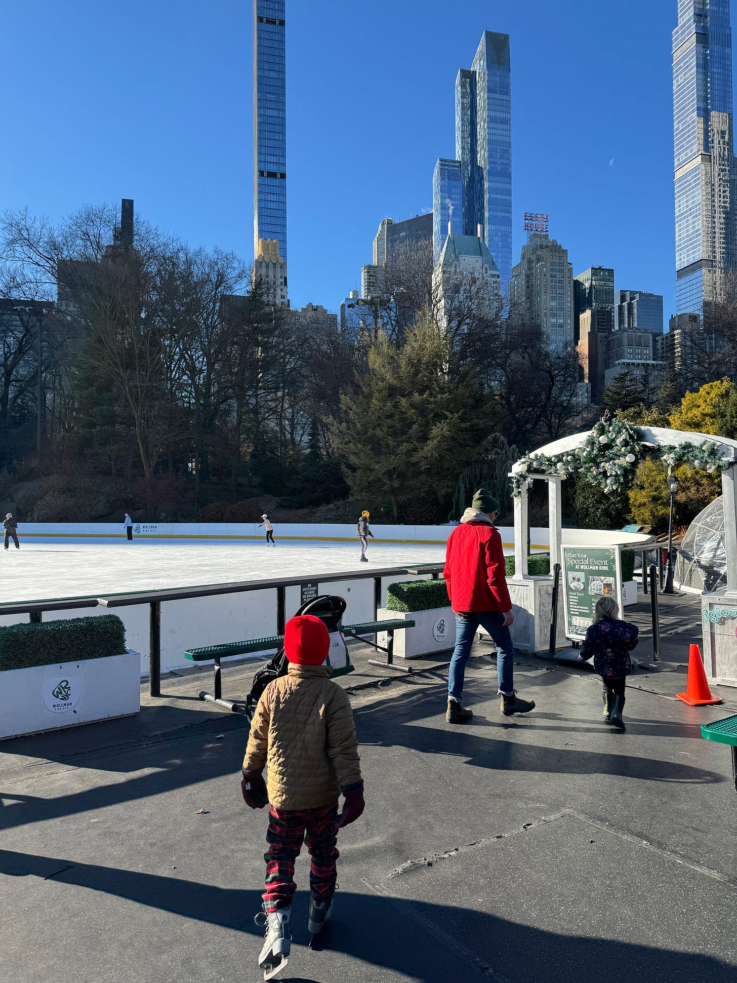 Took Theo ice skating in NYC, our third year doing it. For the first 20 minutes his legs were noodles. I was holding him up. It was hard. On maybe his 100th slow fall down to the ice I found myself laughing so hard I could feel tears forming. It was comical, so hard but also light. I reminded myself that he is literally learning how to move on two thin pieces of metal on slippery ice. We decided to pick a spot in the near distance, a flag or a mountain of dirt, and “glide” like birds towards it. Slow, arms out. We skated holding hands, for more than an hour. Slow and focused on a spot. When we reached it we took a break then picked a new spot.